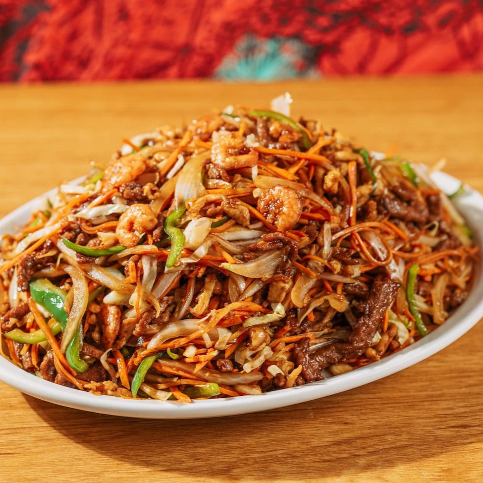 Macarrão de arroz c/ ovos, carne, frango e legumes desfiados ao curry