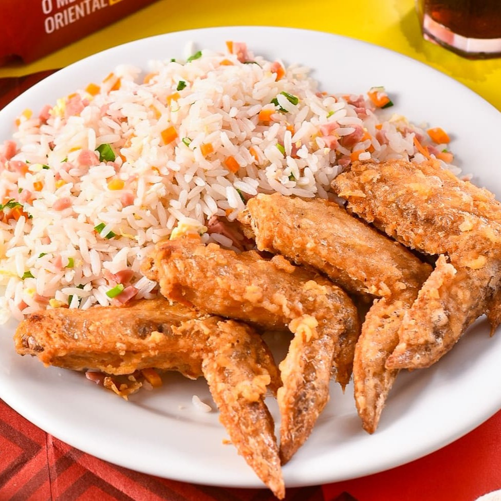 Composição da marmita 4 asinhas empanadas acompanhadas de Arroz Chop Suey