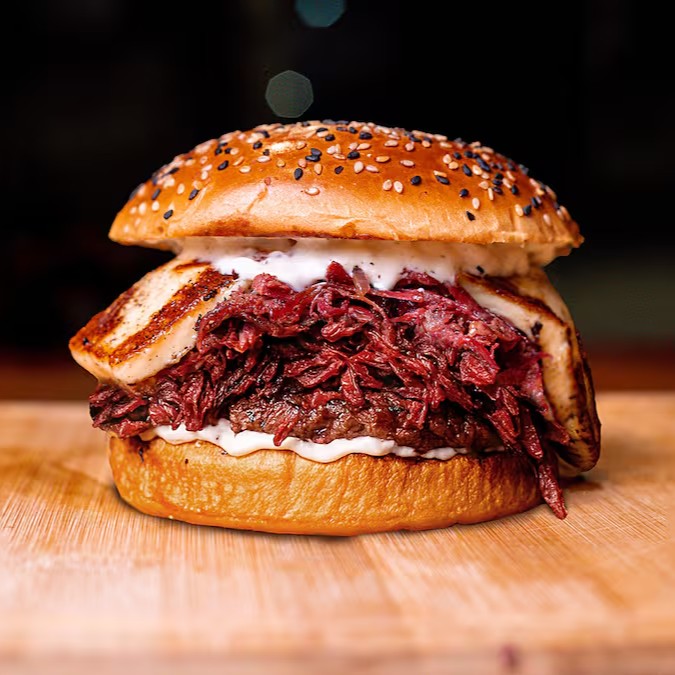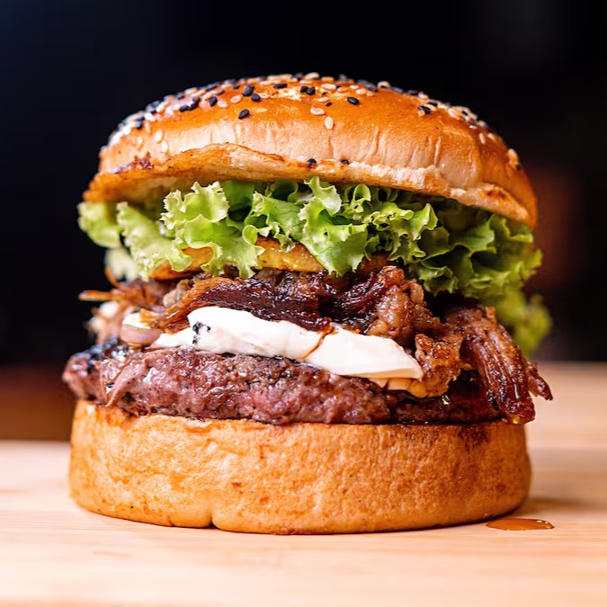 Pão Brioche com Gergelim, Blend 150g, Charque desfiada, Queijo Coalho, Mel de Engenho, Cebola Caramelizada e Maionese artesanal.