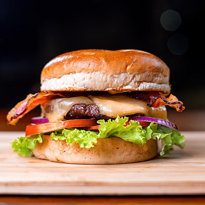 Pão Brioche, Blend 150g, Muçarela, Bacon, Alface, Tomate, Cebola Roxa e Maionese artesanal.