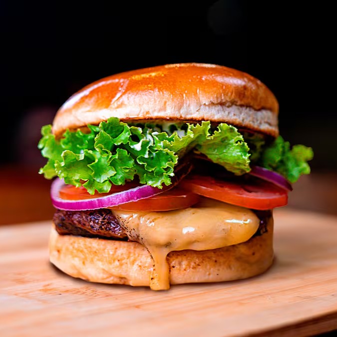 Pão Brioche, Blend 150g, Muçarela, Alface, Tomate, Cebola Roxa e Maionese artesanal.