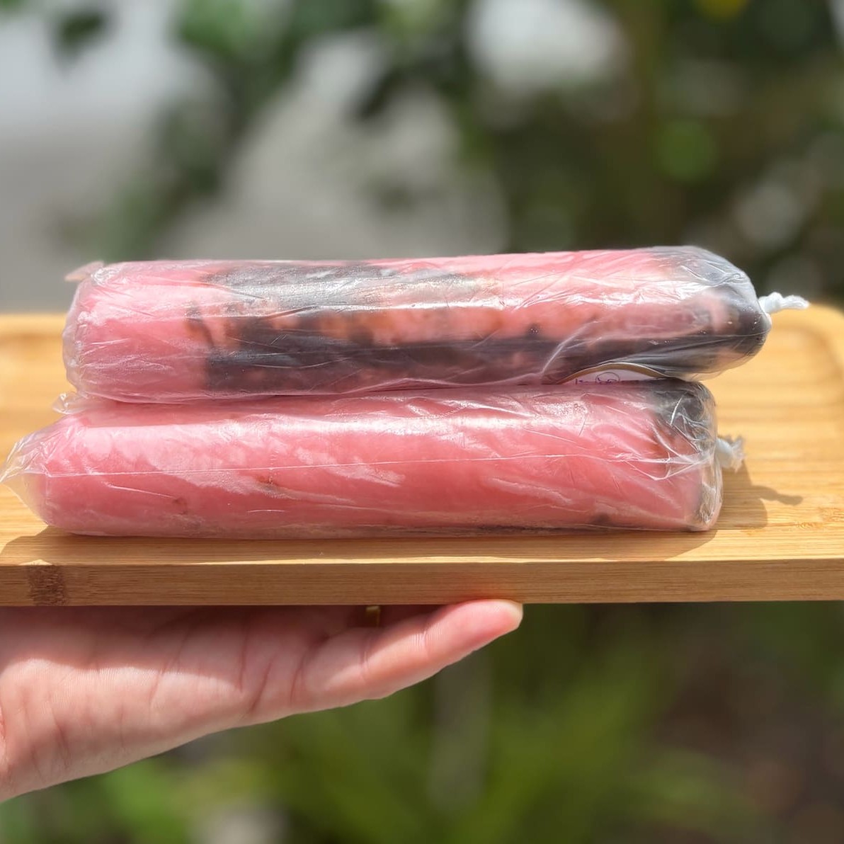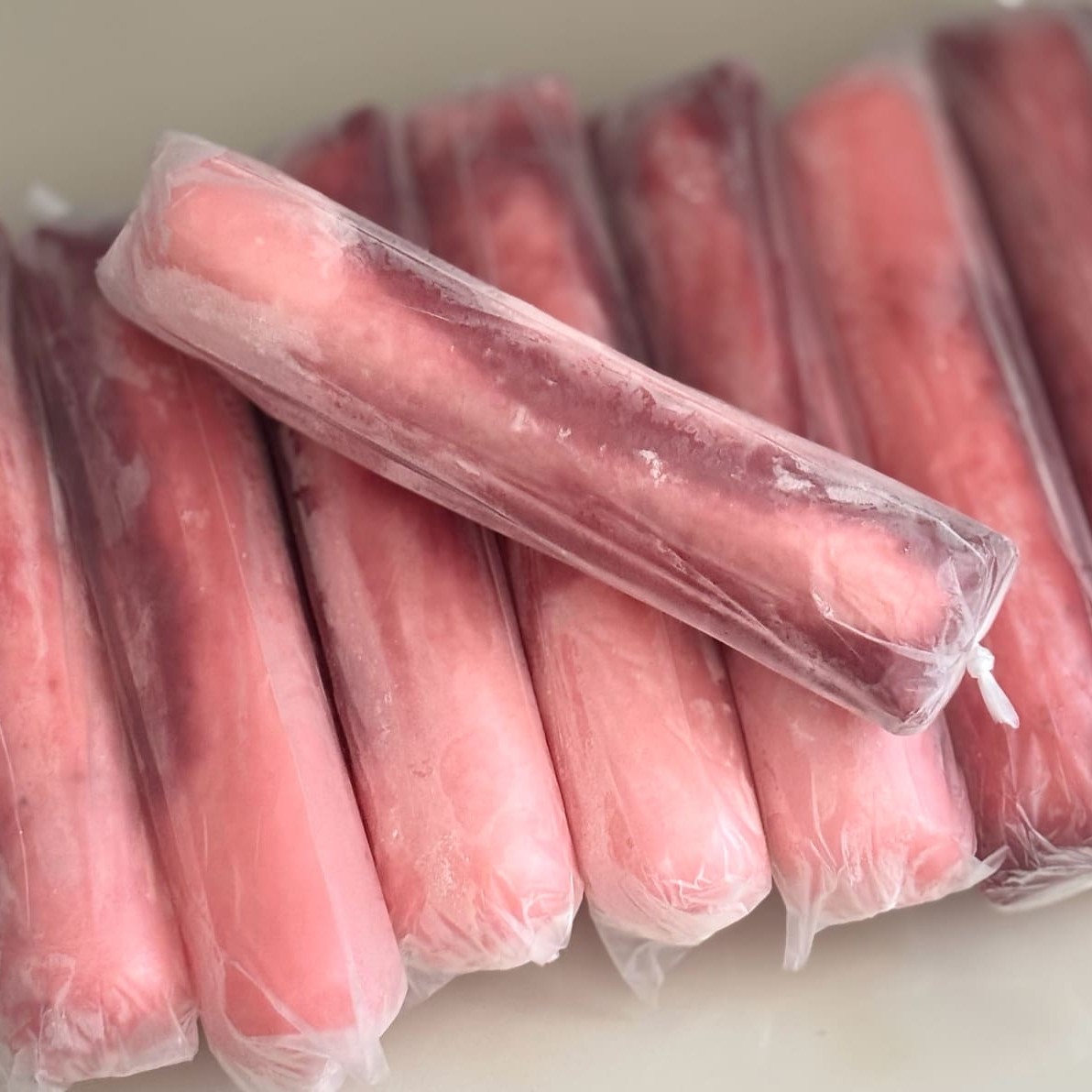 Sacolé gourmet super cremoso com geleia artesanal de morango . Pesa aproximadamente 150g