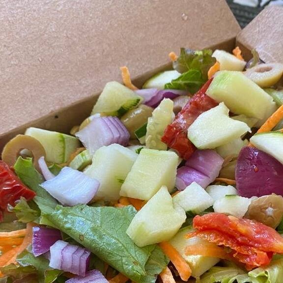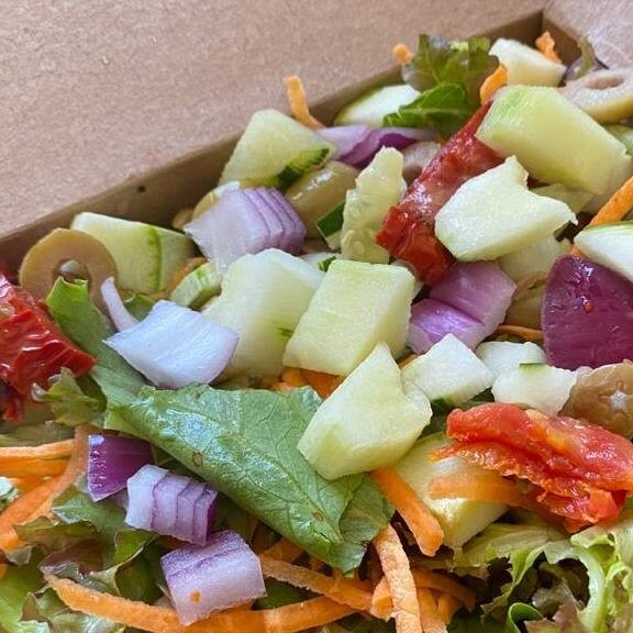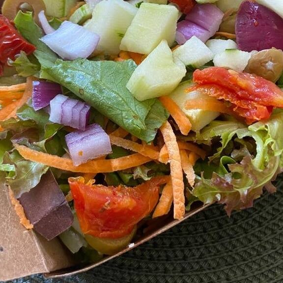 Mix de folhas crocantes com grão de bico, , milho, cenoura, tomate em cubos, pepino, cebola roxa, coberta de mix de granola. Toda salada acompanha uma rodela de limão para potencializar a absorção do ferro.