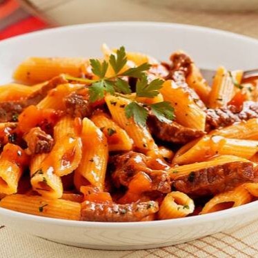 Penne de massa de arroz, coberto com um molho bolonhesa de carne de soja, manjericão e tomate, tudo junto num delicioso prato pra você.