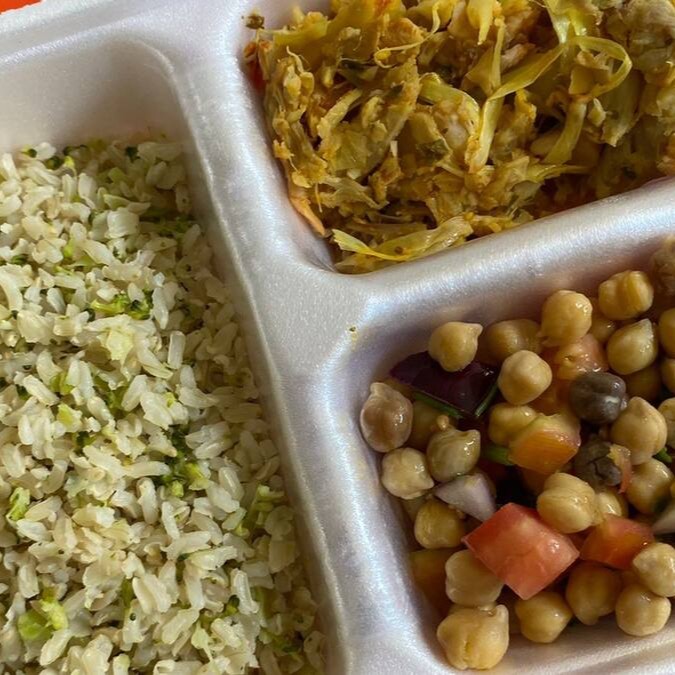 Deliciosa carne de jaca temperada a moda da casa, acompanhada e grão de bico e arroz de brócolis.
