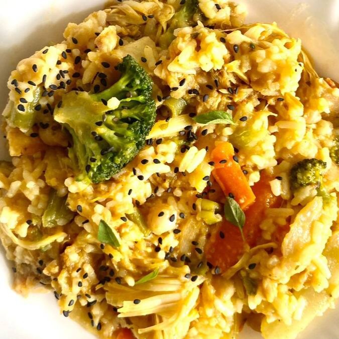 Risoto bem molhadinho de carne de jaca com grão de bico e legumes