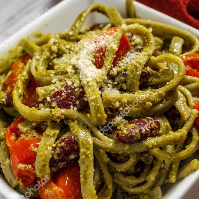 Nosso fusilli tricolor, regado ao molho de tomate artesanal, champignon , ervilha, tomate picado e manjericão.