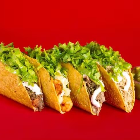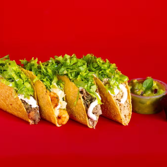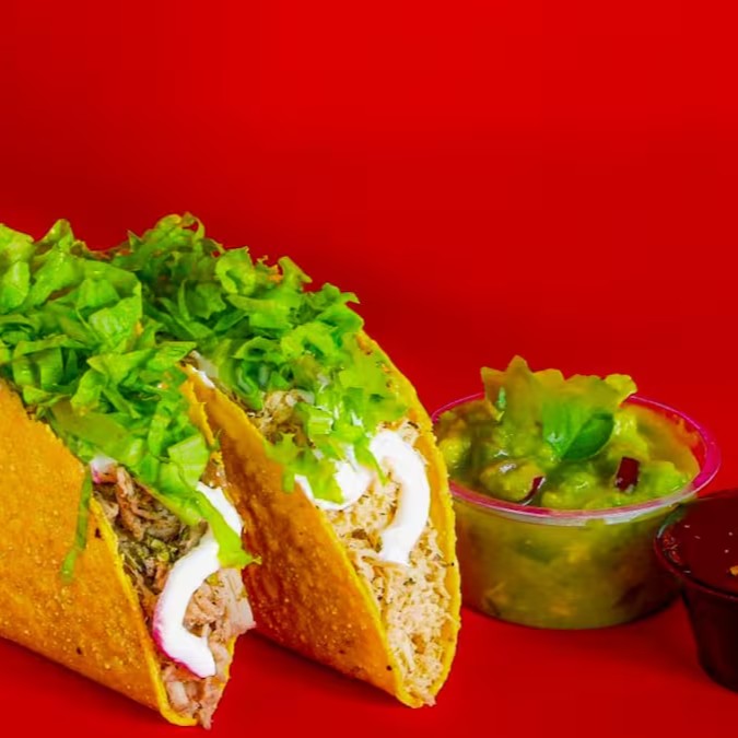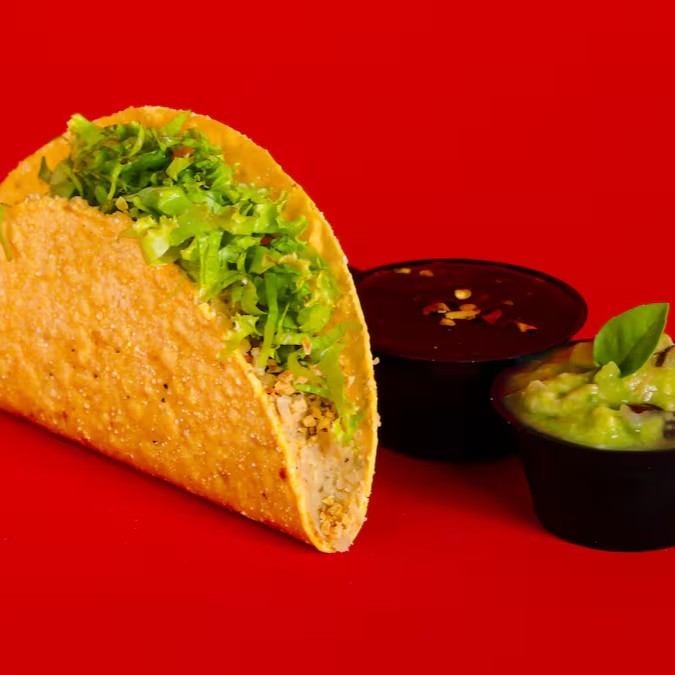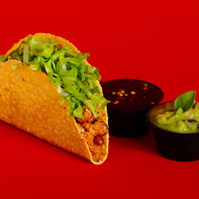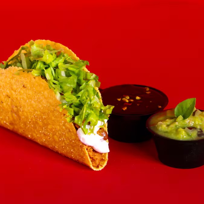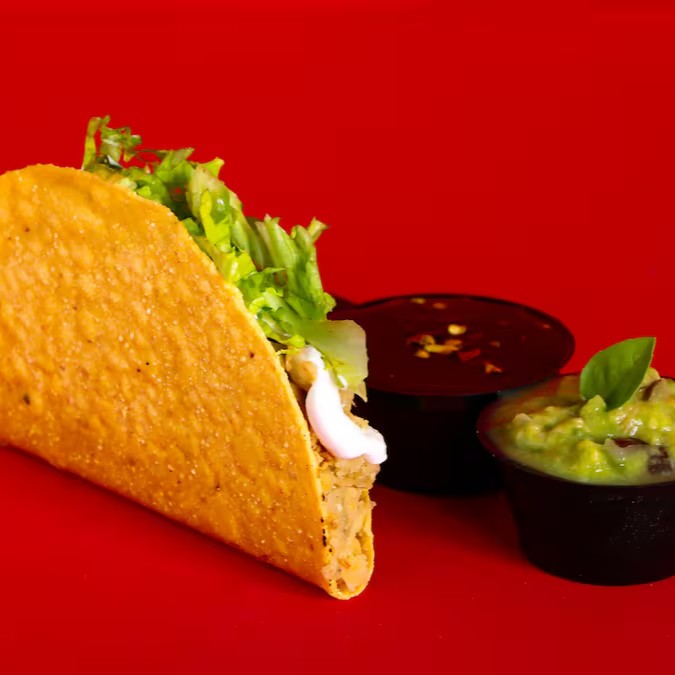 Tortilla de milho crocante, recheado com chilli vegano (Soja e feijão), tempero mexicano, com ou sem pimenta, guacamole e alface.