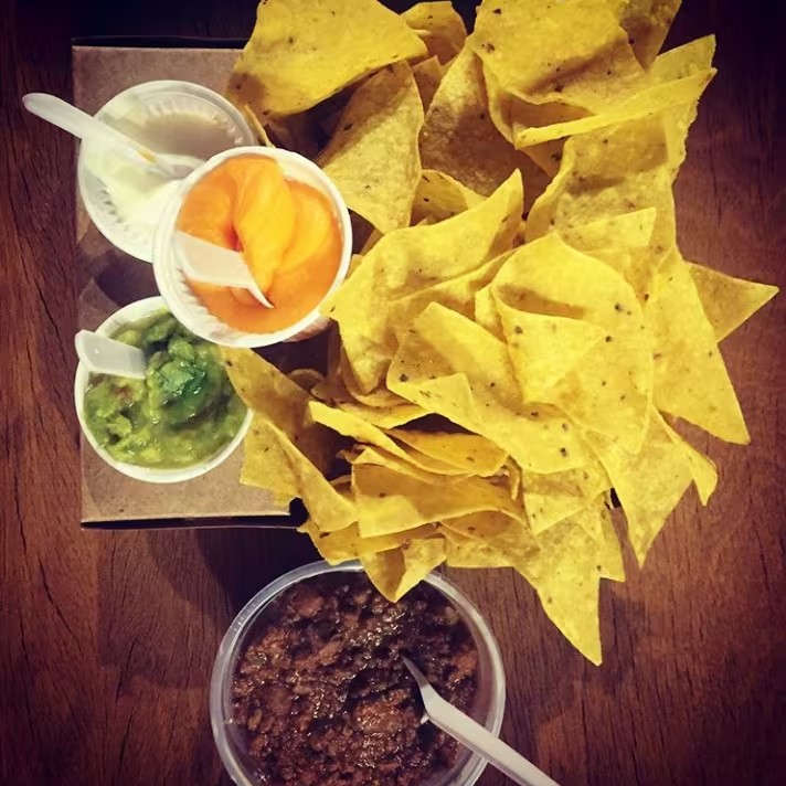 Porção de mini tortilhas de milho crocante, acompanha porção de chilli vegano (Carne moída com feijão e especiarias mexicana) com ou sem pimenta + guacamole à parte + sourcream + cheddar.