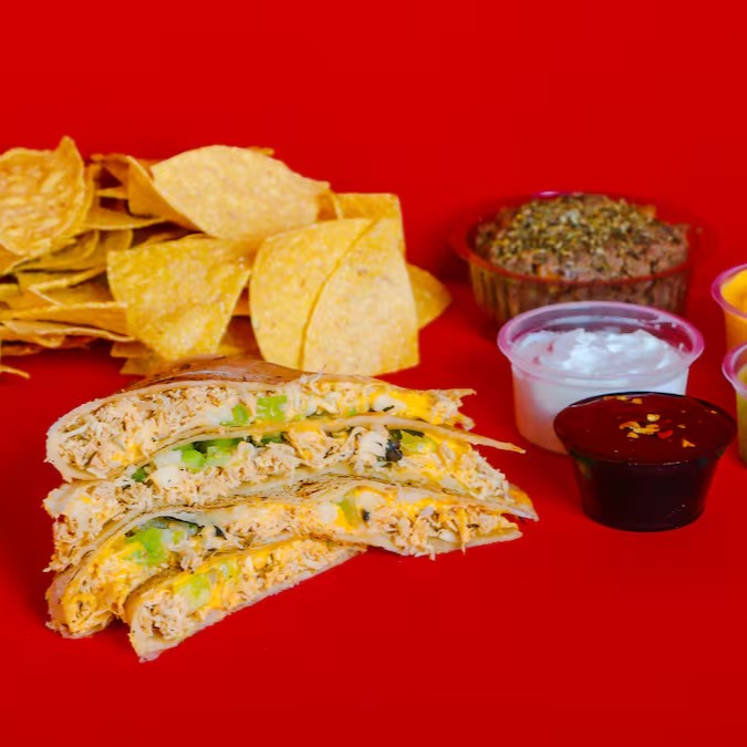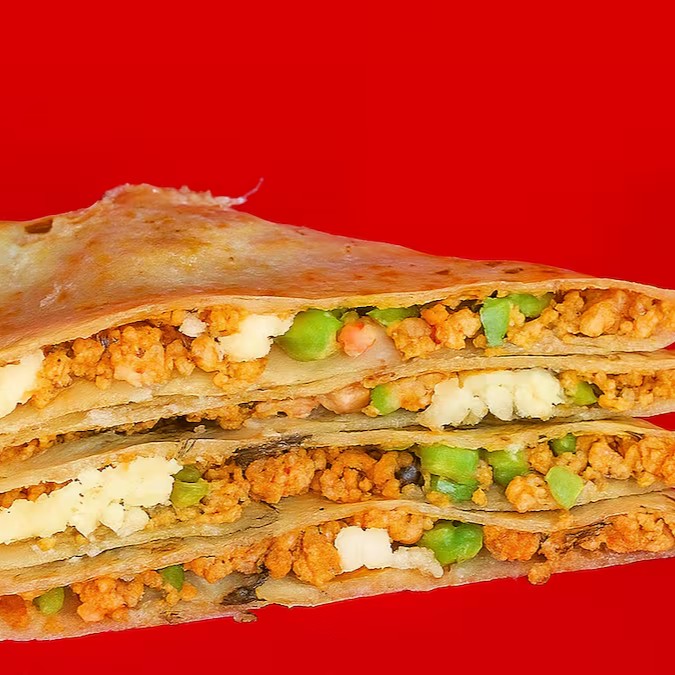 4 fatias de tortillas de trigo dobradas, levemente tostadas na chapa, com recheio de chilli de soja c tempero mexicano, queijo mussarela, tomate, manjericão. Não acompanha molho a parte