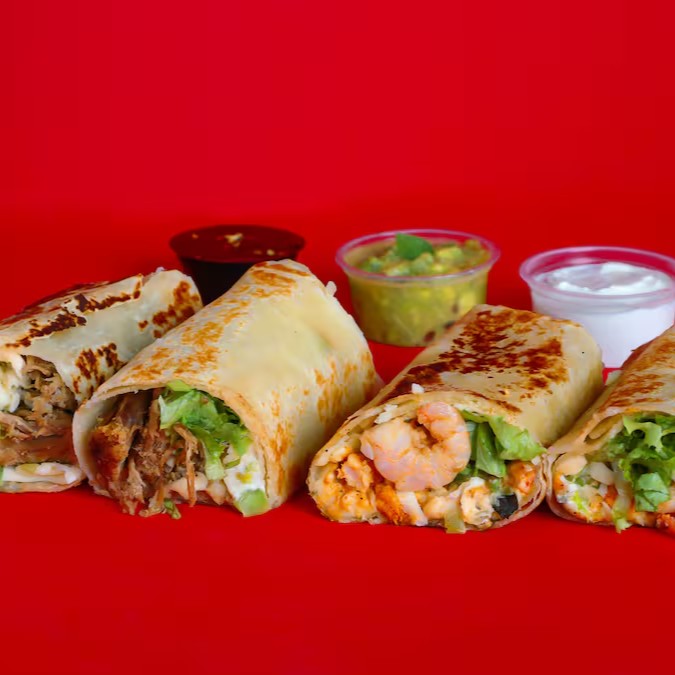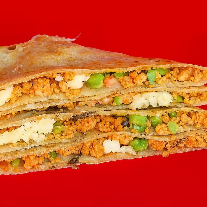 4 fatias de tortillas de trigo dobradas, levemente tostada na chapa, com recheio de chilli de soja, tempero mexicano com ou sem pimenta, tomate e manjericão. Não acompanha molho a parte