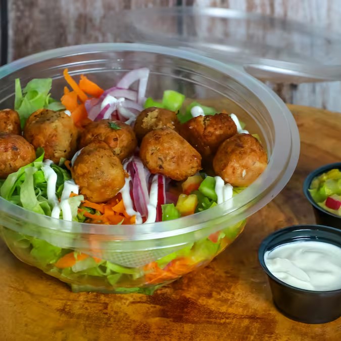 Falafel com especiarias árabes, cebola roxa, alface, tomate e cenoura gratinada. Acompanha 1 opção de molho à parte.