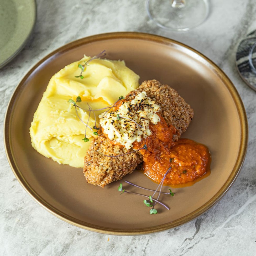 O frango à parmegiana é uma receita tradicional italiana. E nós conseguimos desenvolver uma receita mais saudável e saborosa, empanada na farinha de castanha de caju e coberta com molho de tomate orgânico da casa. Para finalizar, gratinamos com queijo coalho. E ainda vem acompanhado de um suave e delicioso purê de batata-doce. Obs: Não trocamos, ou retiramos ingredientes. É de comer rezando!