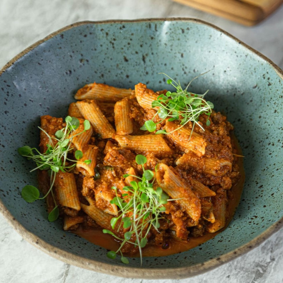 Este magnífico Penne integral é regado com um saboroso e delicioso molho bolonhesa de acém puro moído com molho de tomate artesanal da casa. Feito com tomates orgânicos e um leve toque de manjericão que deixa essa receita com um sabor especial. Experimente e surpreenda-se! Obs: Não trocamos, ou retiramos ingredientes.