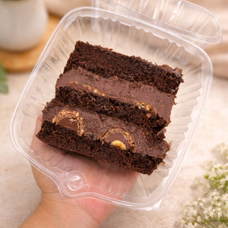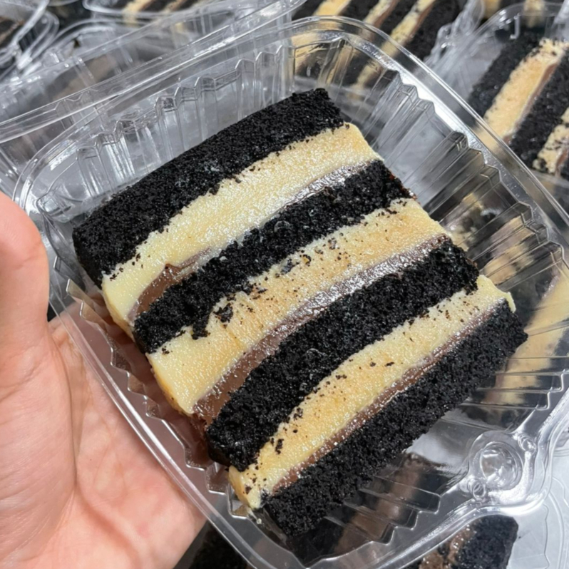 Fatia na massa de cacau black super molhadinha, recheio de brigadeiro tradicional.