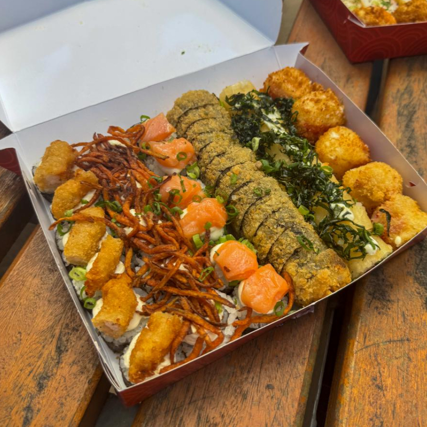 30 peças: 10 carioca de salmão, 5 uramaki de camarão, 5 harumaki de kani com geleia de morango, 5 harumaki de salmão, 5 uramaki de camarão especial.