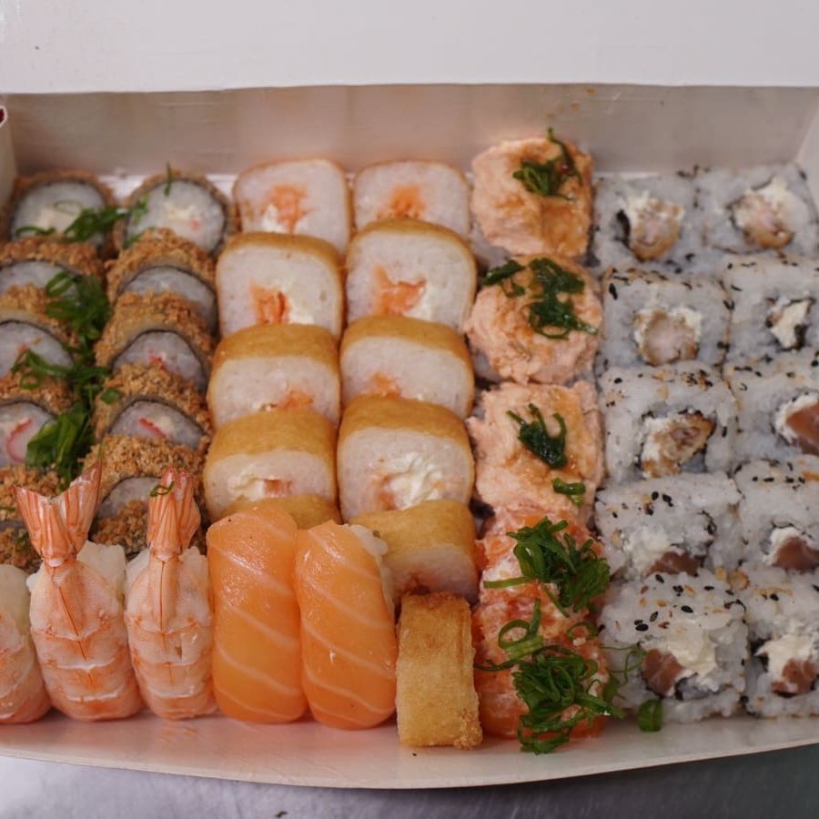 20 carioca de kani, 10 uramaki de camarão, 10 uramaki de salmão, 10 uramaki de kani empanado, 10 hossomaki de salmão.