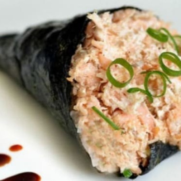 Temaki na alga recheado com arroz, pasta de salmão, cream cheese e cebolinho.