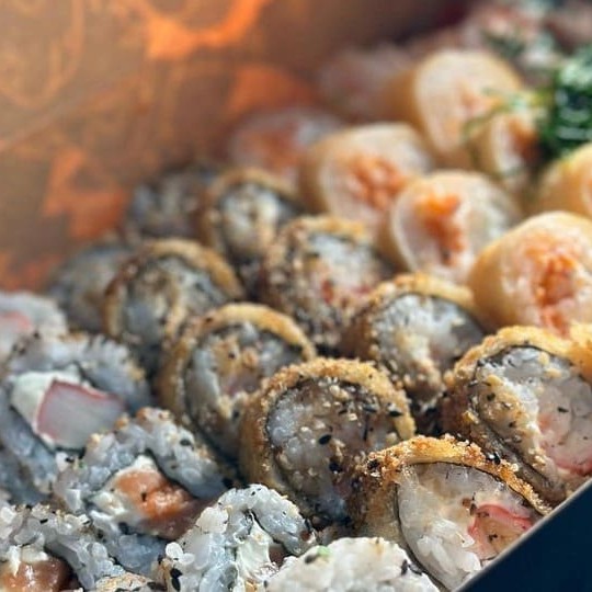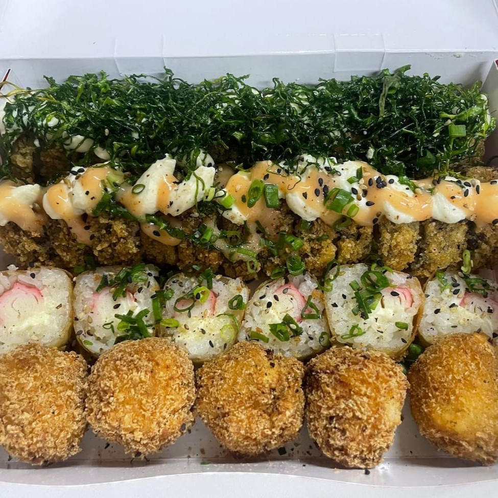 Arroz enrolado na massa empanada e crocante, com recheio de kani e cream cheese.