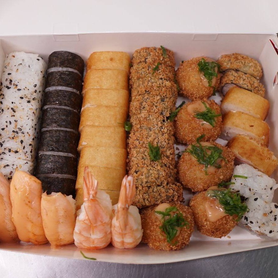 3 niguiri maçaricado com maionese space, 2 niguiri de camarão, 5 bolinho de salmão, 12 carioca de salmão, 12 harumaki de kani, 10 uramaki de camarão, 12 hossomaki de salmão com cream cheese.