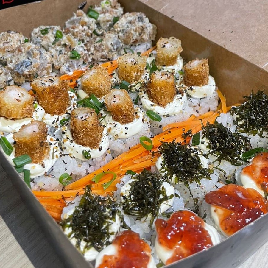 10 uramaki de salmão especial maçaricado com cebola caramelizada, 5 uramaki com cream cheese e geleia de morango, 5 uramaki com Doritos, 2 ebi ball, 2 joy, 2 niguiri de kani, 2 niguiri de salmão, 3 skin com molho especial.