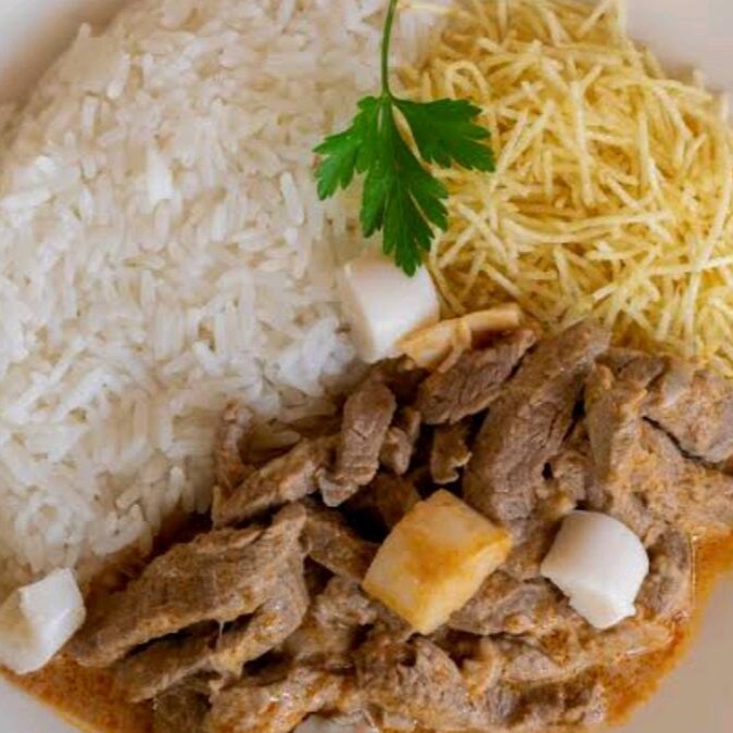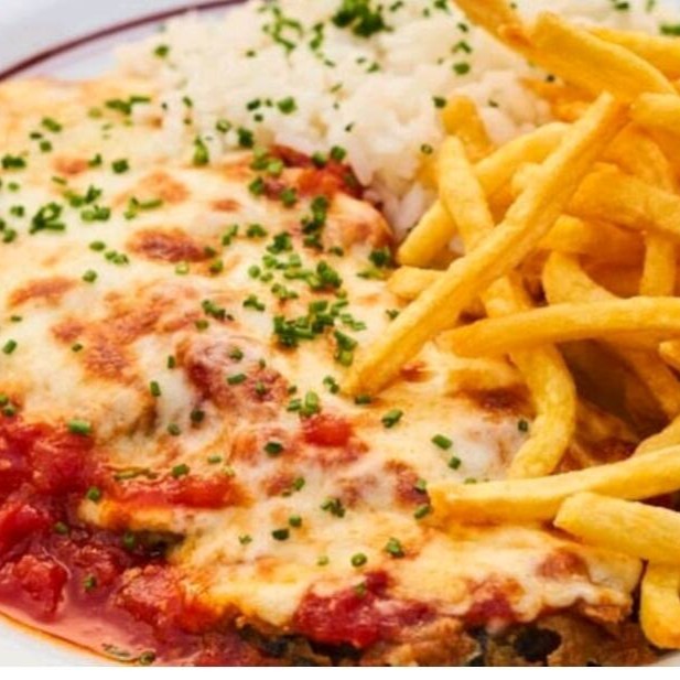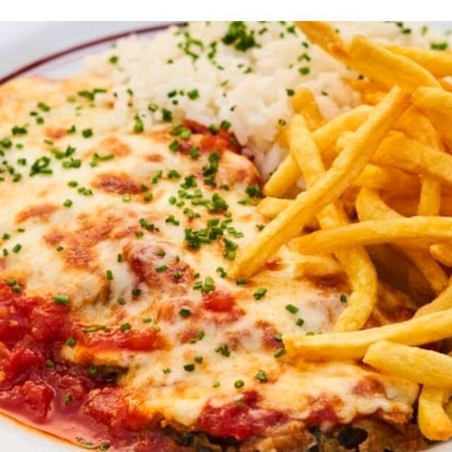 Acompanha; file de carne empanado e frito com queijo muçarela, macarrão e batata frita ao molho de tomate