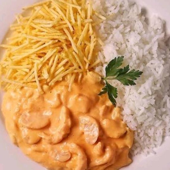 Acompanha; file de frango empanado e frito com queijo muçarela, macarrão e batata frita ao molho de tomate
