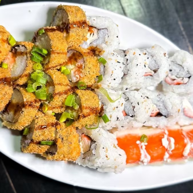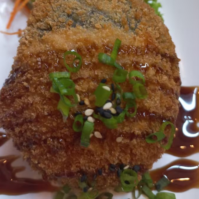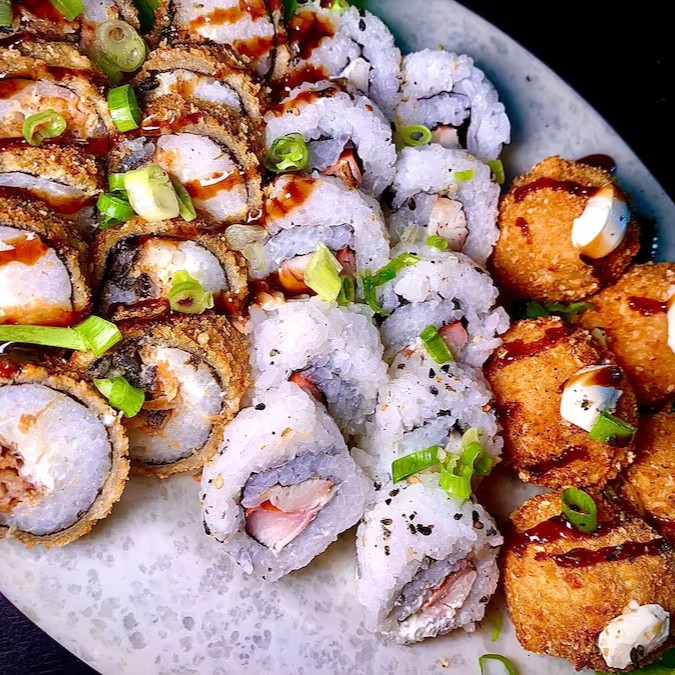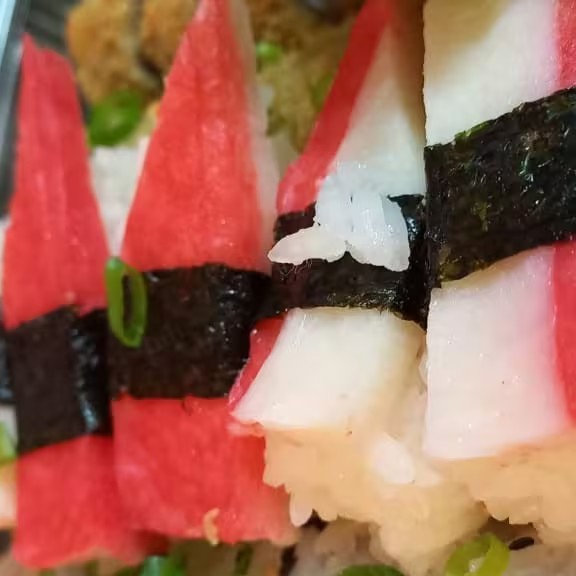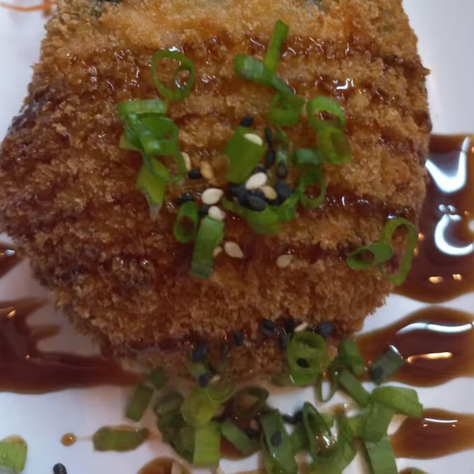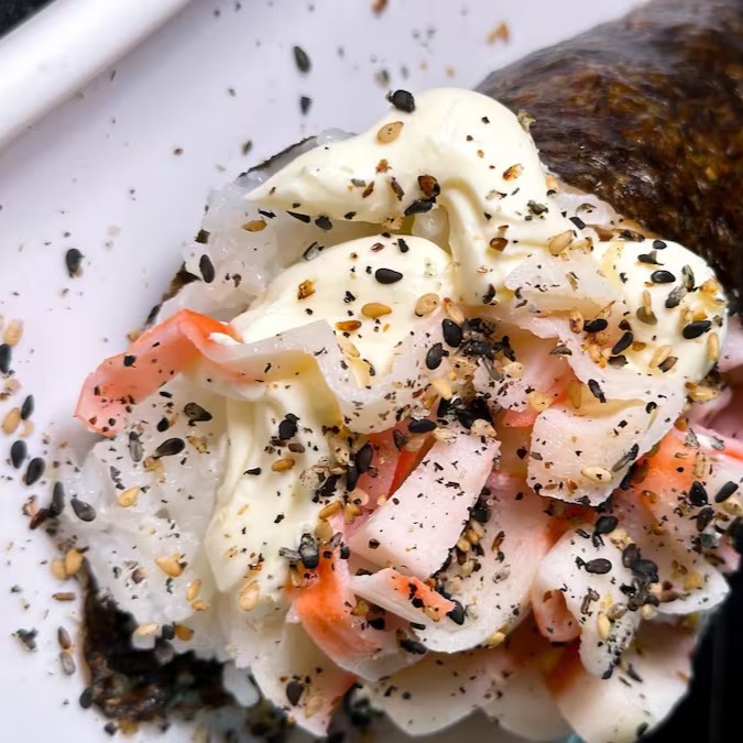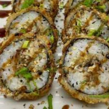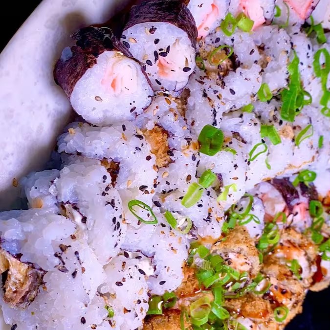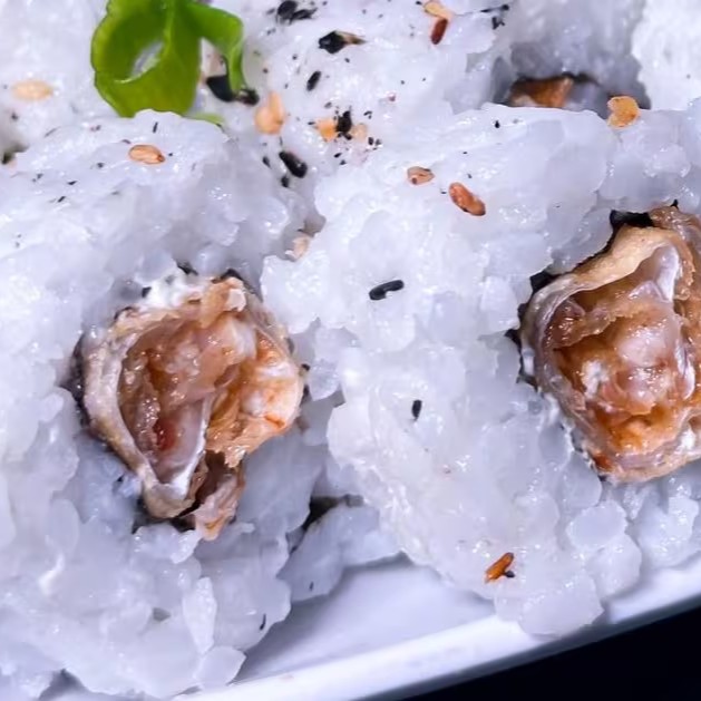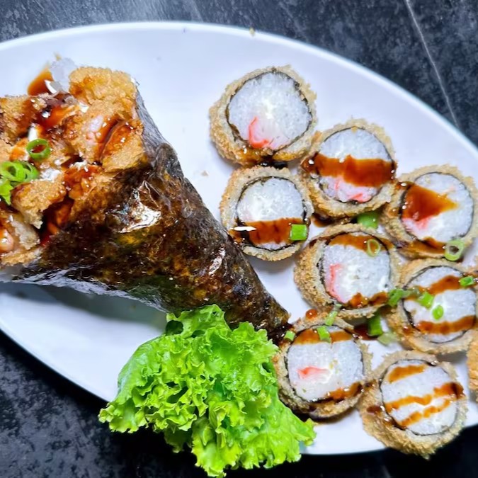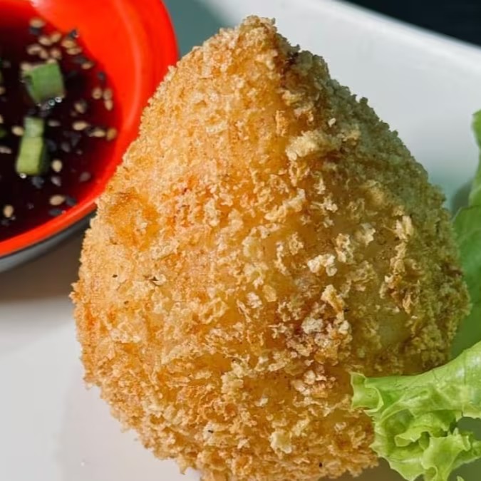 Bolinho de arroz, com saboroso recheio de Kani e cream cheese, todo envolto na alga nory e frito.