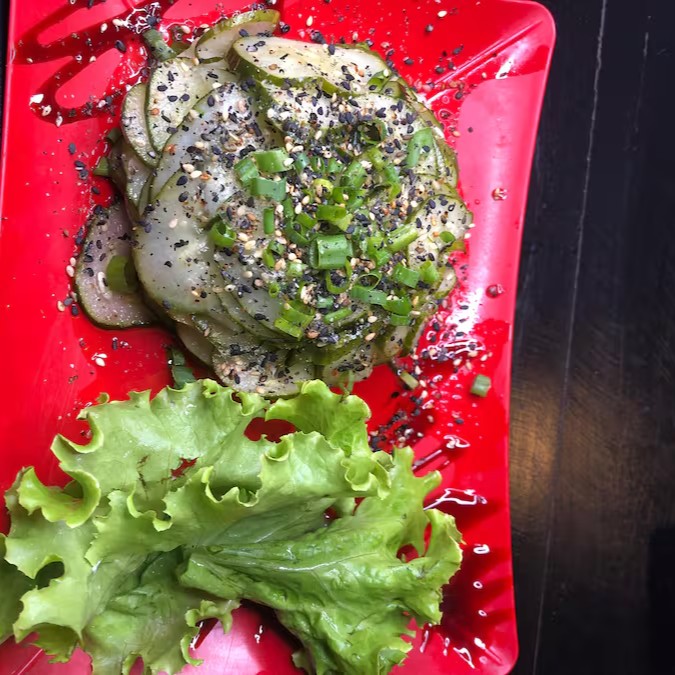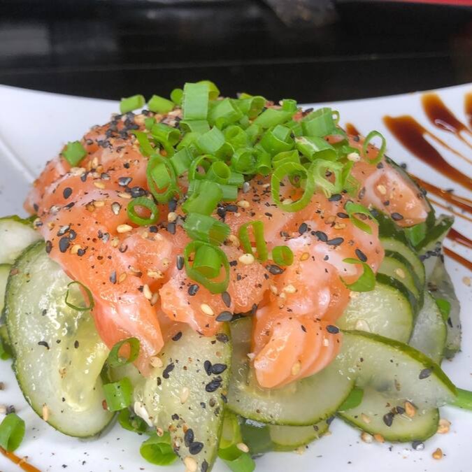 Pepino japonês com delicioso tempero e coberto com cubos de salmão.
