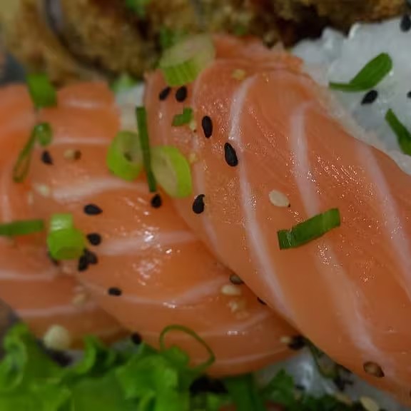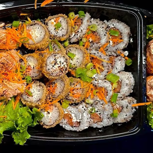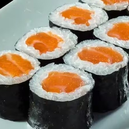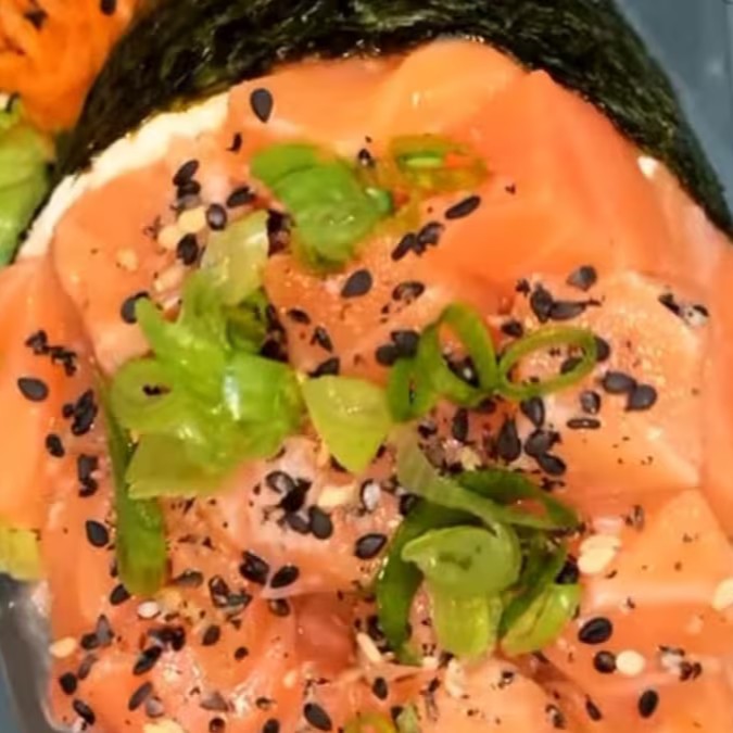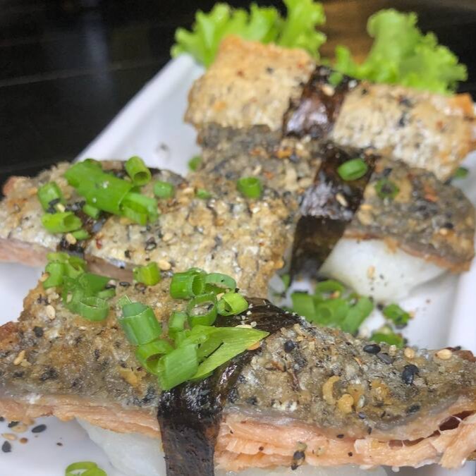 Bolinho de arroz, com saboroso recheio de salmão e cream cheese, todo envolto na alga nory e frito.