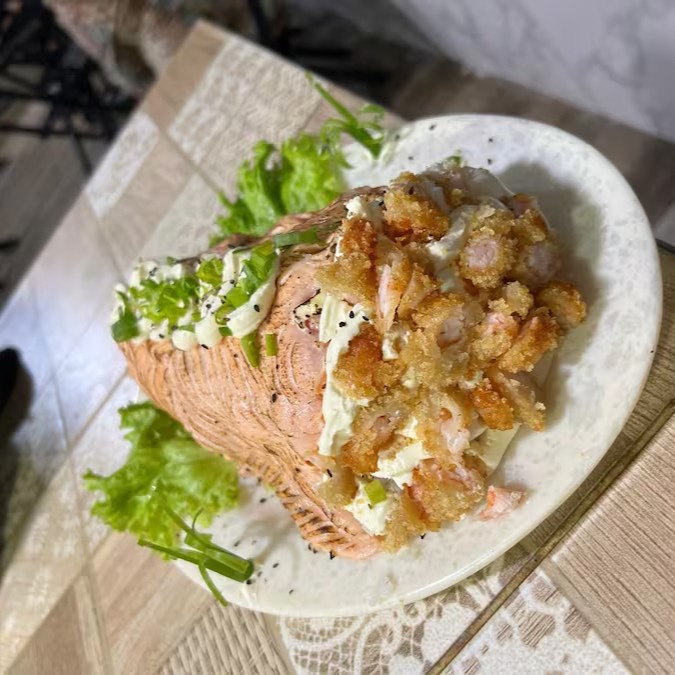 Cone todo revestido com lâmina de salmão maçaricado, com explosão de recheio de arroz, cream cheese e salmão empanado.
