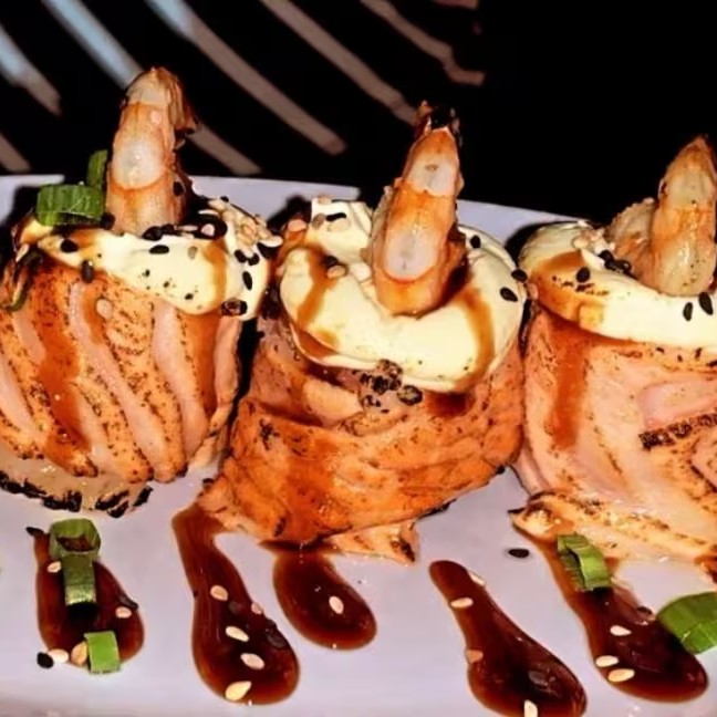 Quadrado coberto com lâmina de salmão maçaricado com explosão de recheio de arroz, cream chesse e camarão empanado.