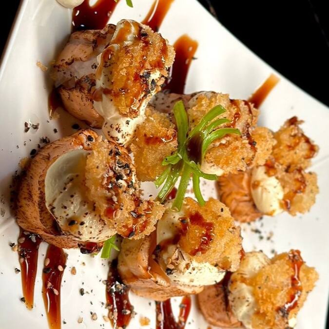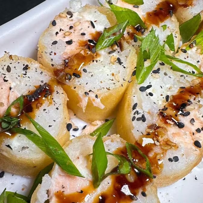 Bolinho de arroz recheado com salmão e cream cheese envolto na massa de harumaki (rolinho) e frito.