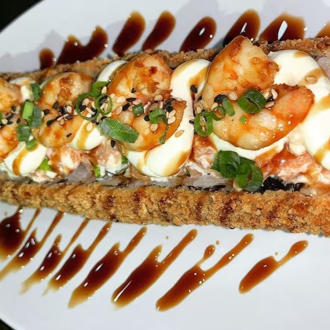 Bolinho de arroz, com saboroso recheio de camarão e cream cheese, todo envolto na alga nory e frito.
