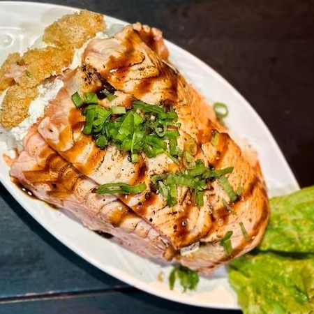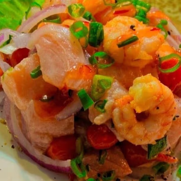 Salada de cebola, com pimenta biquinho e cebolinha em um tempero delicioso, recheada com cubos de salmão e camarão.