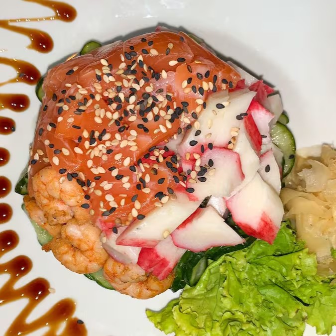 Pepino japonês com delicioso tempero coberto com cubos de salmão, camarão e kani.