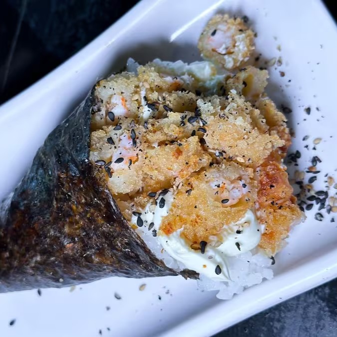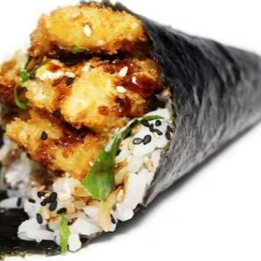 Cone de nory, todo empanado e frito, com saboroso recheio de arroz, Cream cheese e kani.