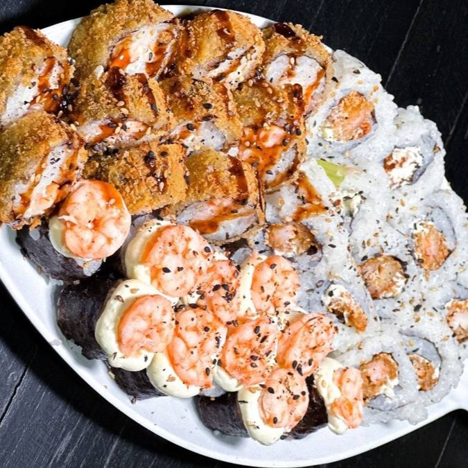 10 carioca de salmão + 10 uramaki camarão empanado + 10 uramaki skin + 10 hossomaki kani