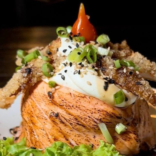 Quadrado coberto com lâmina de salmão maçaricado com explosão de recheio de arroz, cream chesse e salmão empanado.