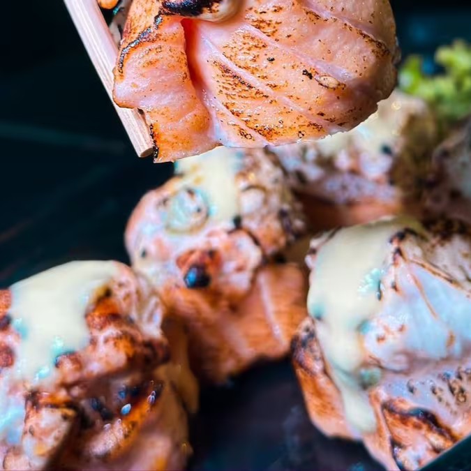 Bolinho de arroz envolto de lâmina de salmão maçaricado, coberto com uma deliciosa pasta de salmão.