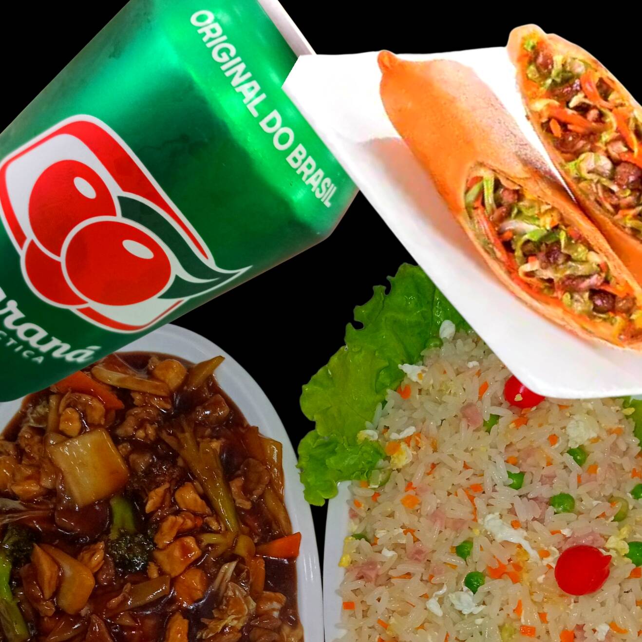 carne, frango, e legumes fatiado, acelga, cenoura, brócolis e chuchu Refrigerante de 1 litro +2 Rolinho primavera
