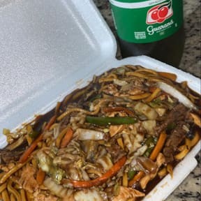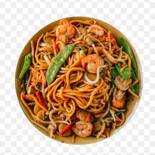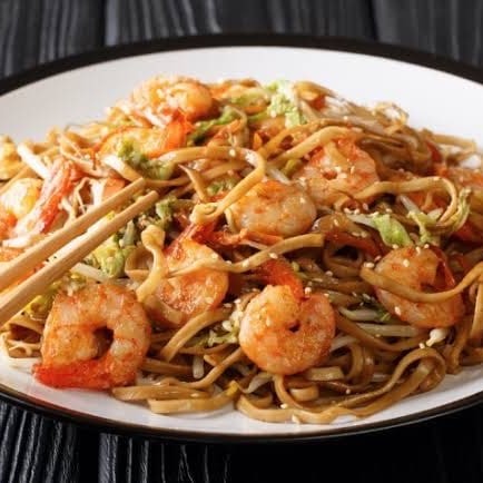 Massa artesanal frita ao molho shoyu, acompanhada de carne, frango, camarão e legumes.