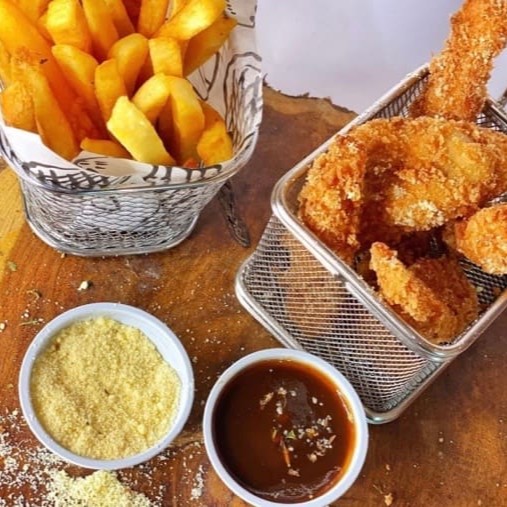 10 tiras de filé de peito empanados na farinha panko + batata frita de acompanhamento.