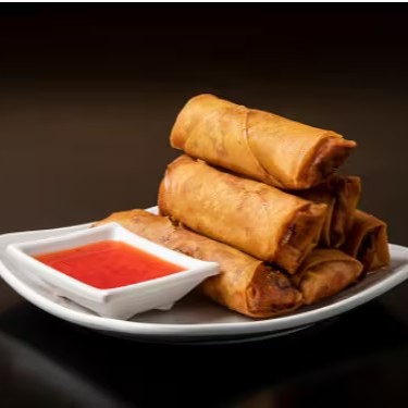 Rolinho primavera de massa fina recheada com repolho e cenoura.