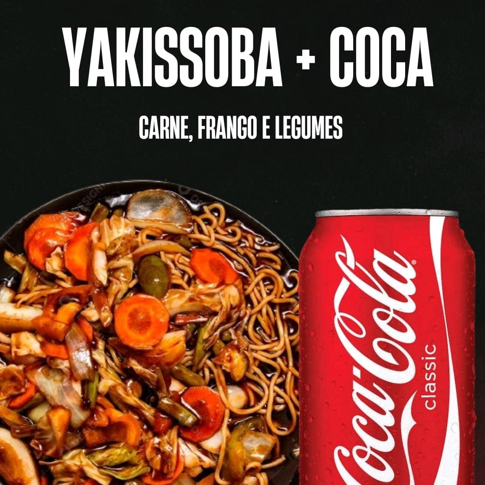 Yakissoba tradicional com carne, frango e legumes, com aproximadamente1kg, ideal para até 2 pessoas mais uma Coca cola de 1litro.