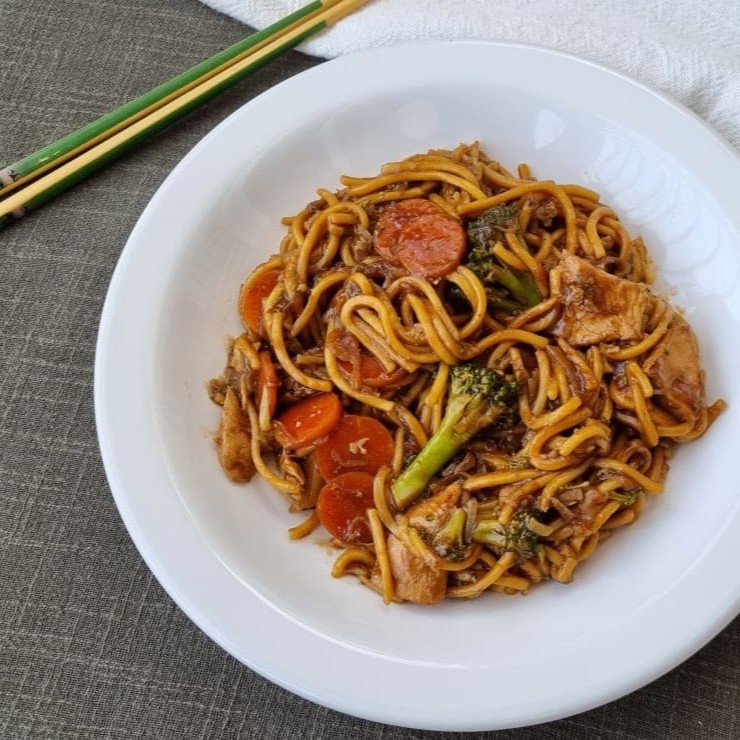 Delicioso Yakisoba tradicional com carne e frango para uma pessoa, com aproximadamente 500g.