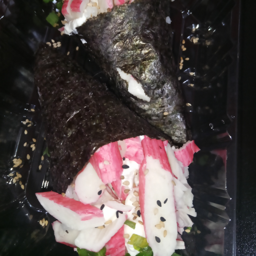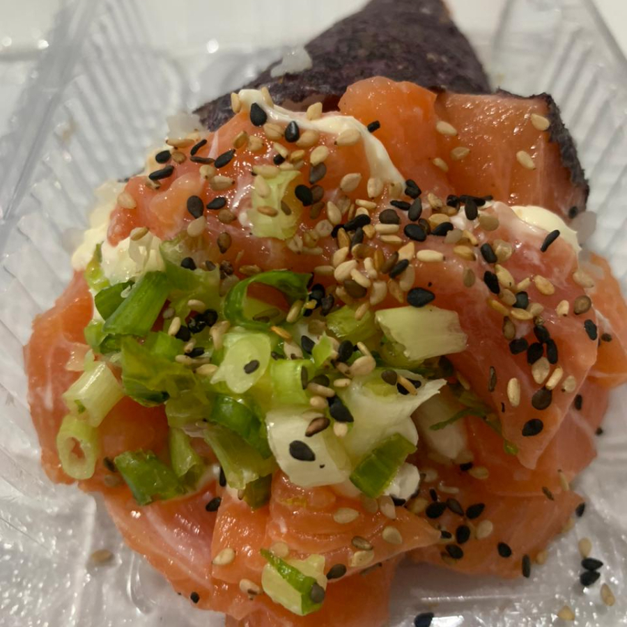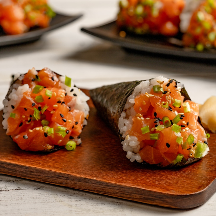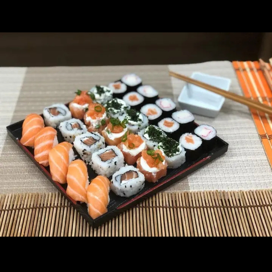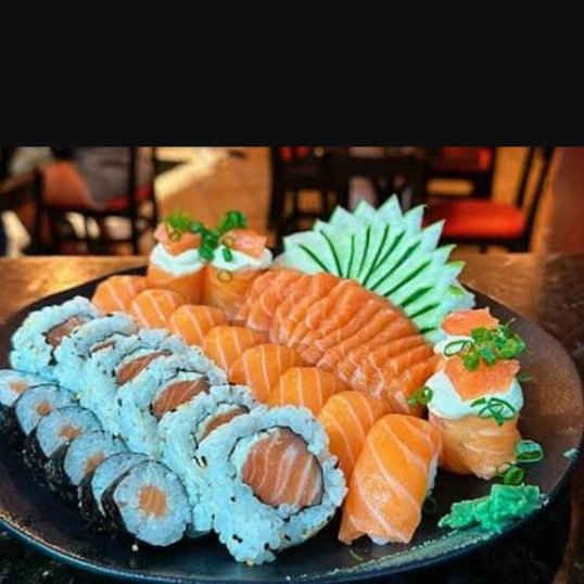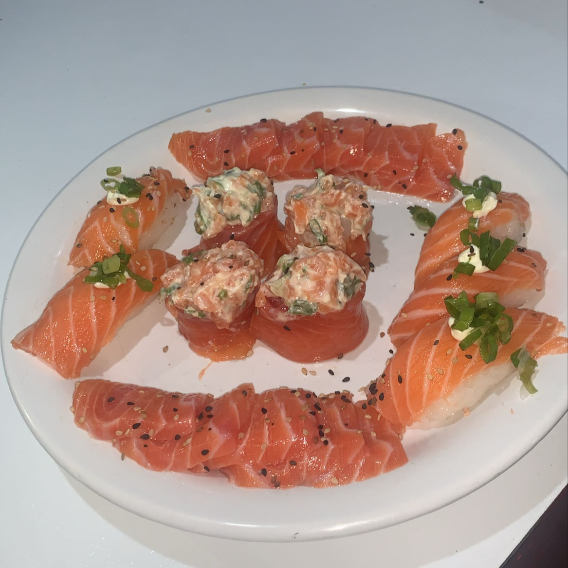 10 carioca de salmão, 10 carioca de kani 5 nigiri de salmão, 5 sashimis de salmão e 10 uramaki salmão