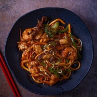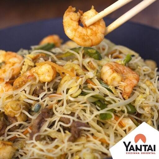 Macarrão de arroz, ovos, camarão, carne, frango, cenoura, acelga e pimentão ao curry. Os ingredientes, não poderão ser substituídos.
