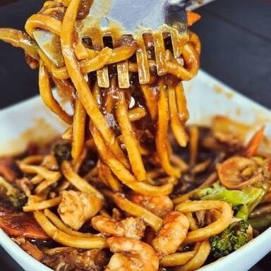 Macarrão, carne, frango e legumes, mergulhados num delicioso molho ao shoyu (os itens, não podem ser substituídos)