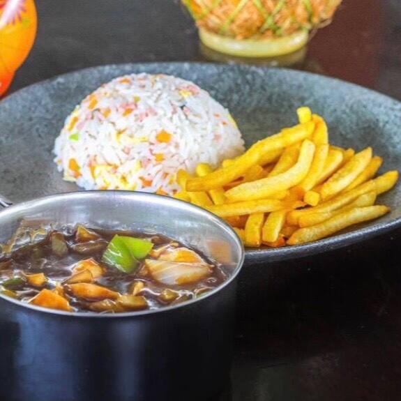 Delicioso frango xadrez + arroz misto + batata frita (os itens, não podem ser substituídos)